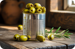 O envase em lata permite que as azeitonas da Califórnia preservem sua qualidade por longos períodos, garantindo que cheguem à sua mesa em perfeitas condições.